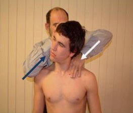 THRUST: é executado com ambas as mãos simultaneamente - a mão esquerda do terapeuta dirige um thrust de baixa amplitude e alta velocidade para baixo e transversalmente para a axila direita do paciente, enquando a mão direita empurra de maneira similar para cima produzindo um movimento de inclinação para a esquerda (e não de extensão).
